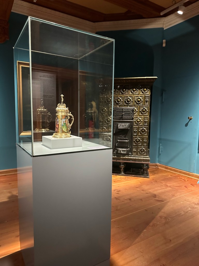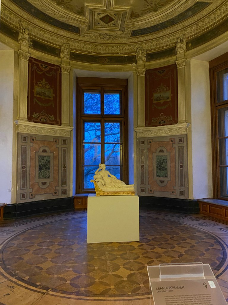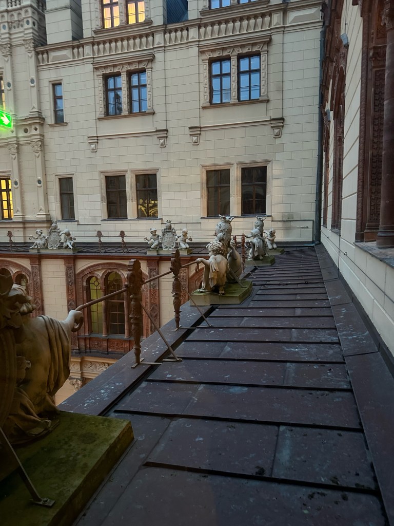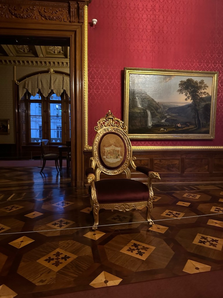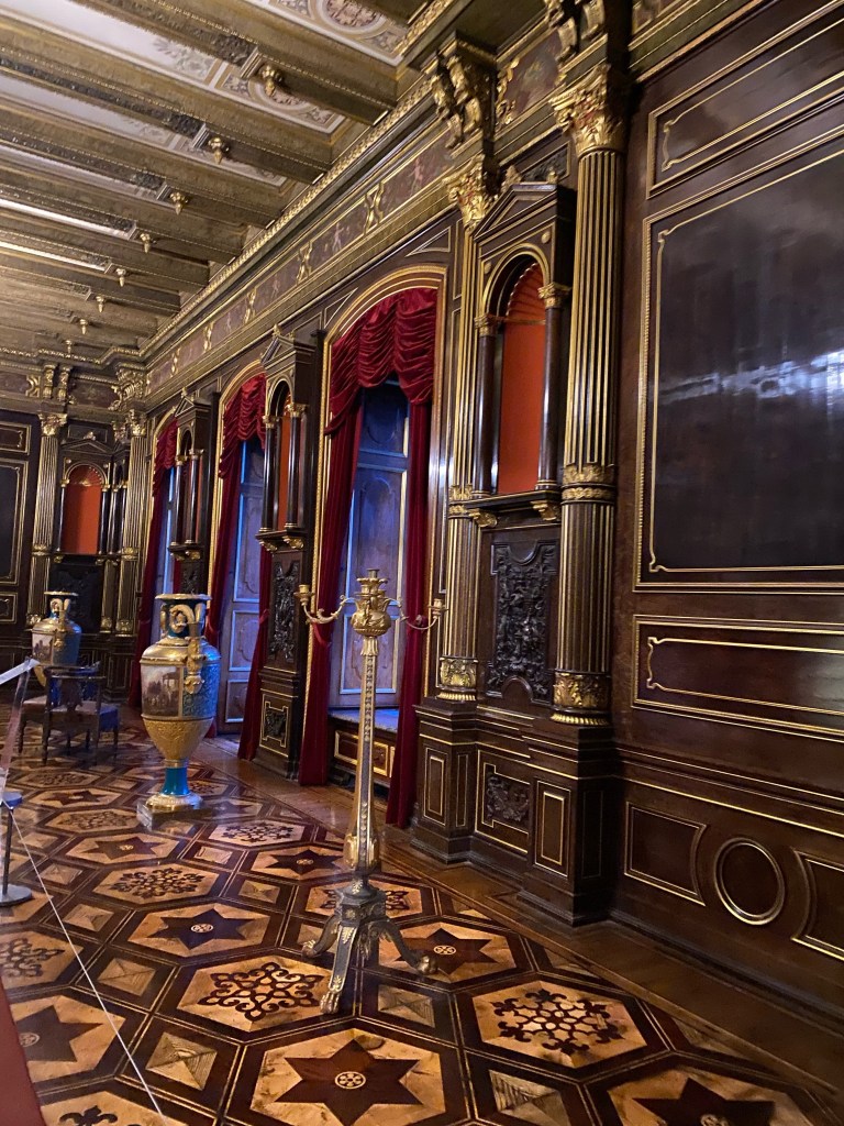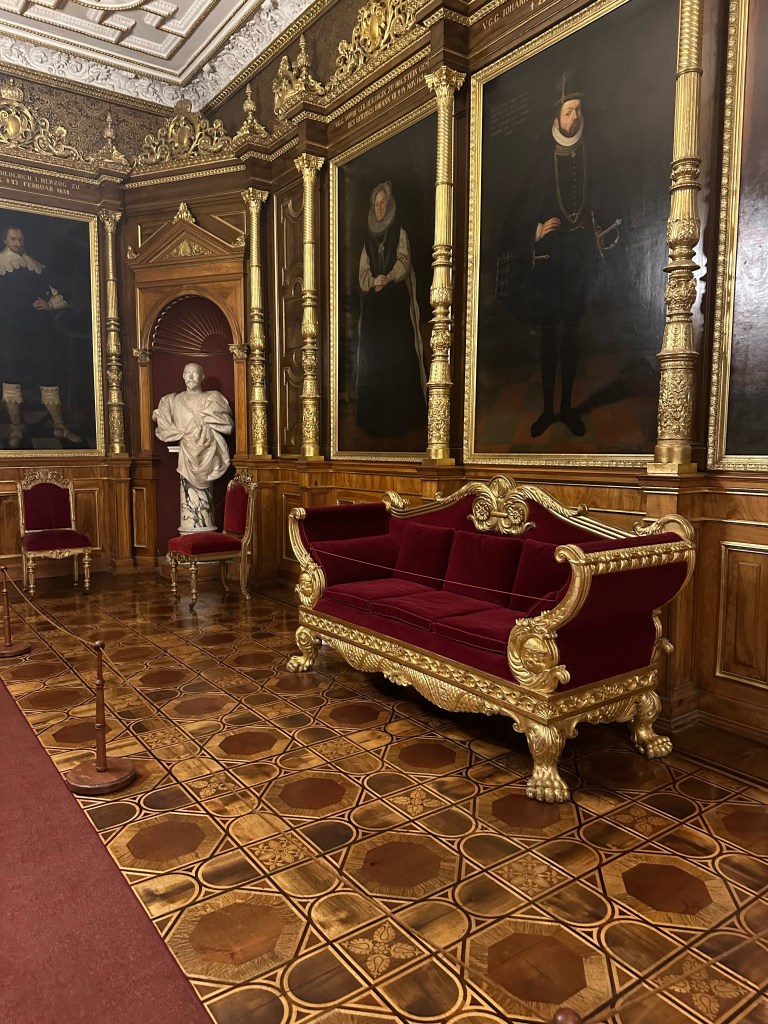 After getting our tickets we rushed up the stairs because by the time we were ready to start our tour of the castle it was 1 hour till they closed. Obviously we couldn’t do a guided tour because it was close to closing time but we still enjoyed it. We walked through the rooms at our own pace and enjoyed the artwork and interior design that surrounded us. Every single detail put into the wall designs were absolutely gorgeous, especially the throne room. The throne room was heavenly. From the gold trims to the beautiful painting on the ceiling it was royally magnificent. When you look up at the ceiling you will also notice the different crest of each city of Mecklenburg surrounding the room. We looked all the way around until we found Rostock‘s crest, which is a griffin. All in all the throne room was definitely my favorite room.