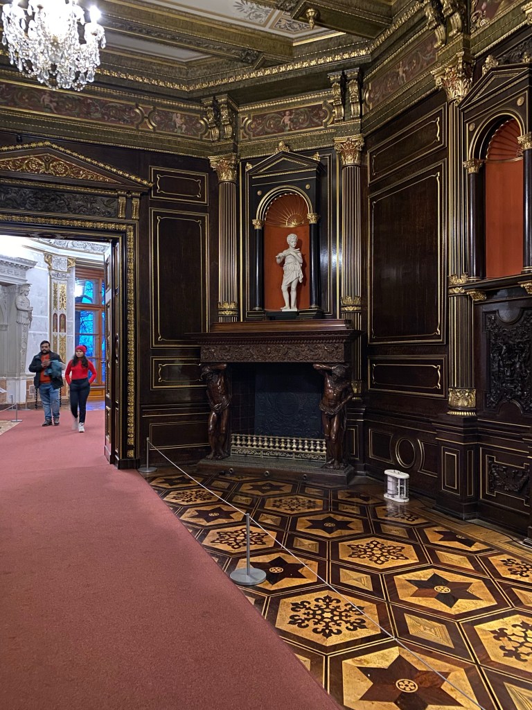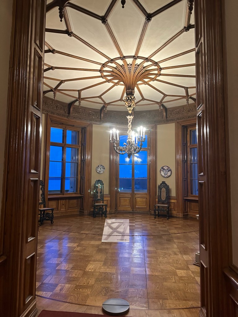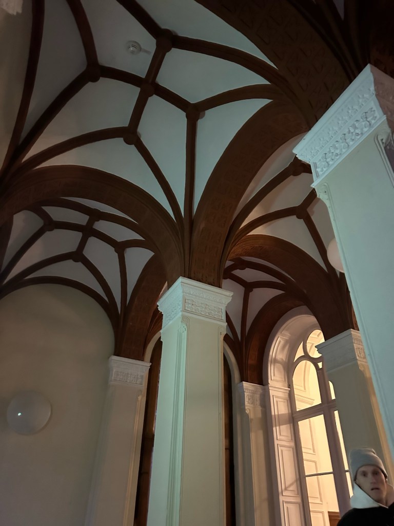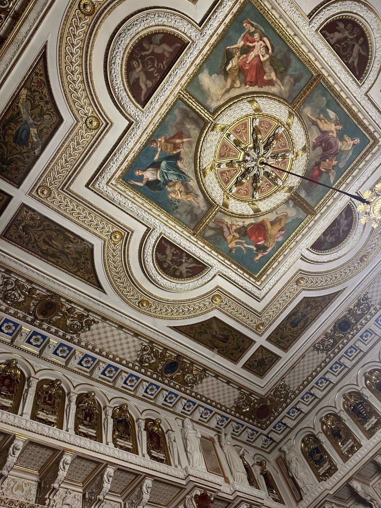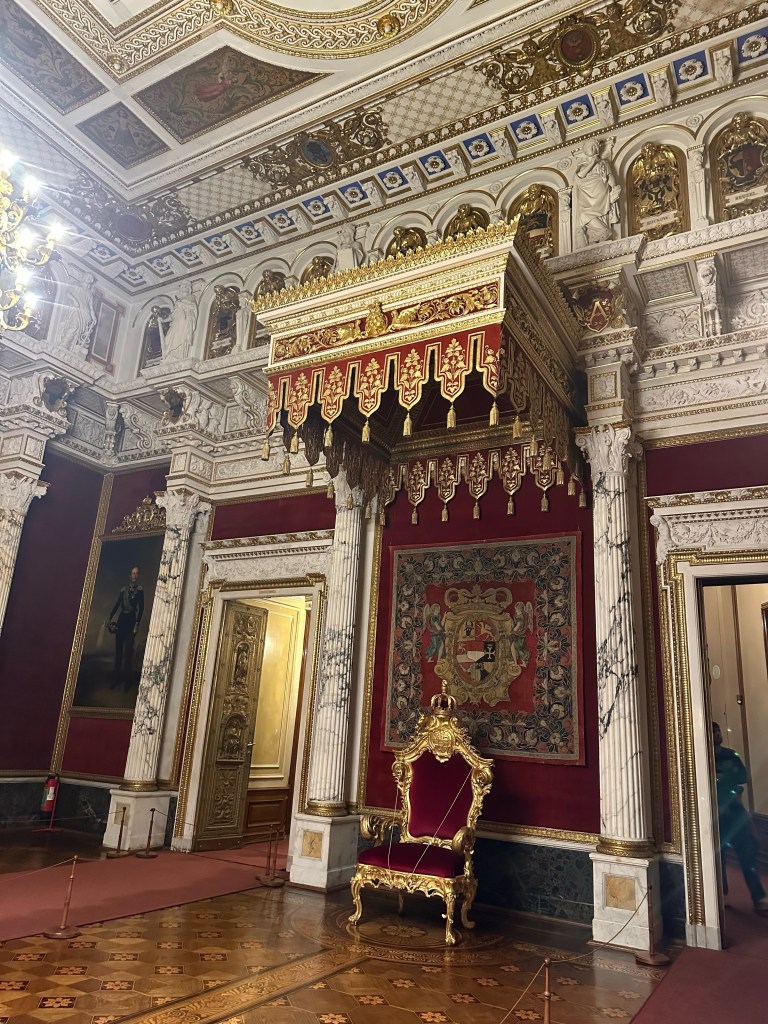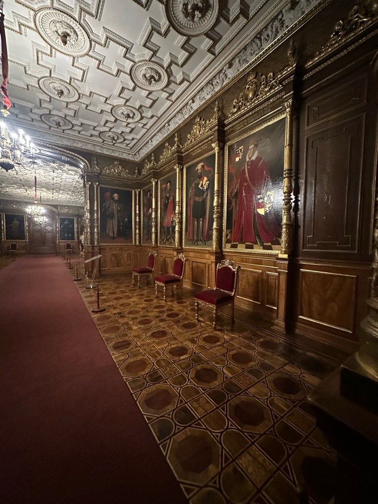 After getting our tickets we rushed up the stairs because by the time we were ready to start our tour of the castle it was 1 hour till they closed. Obviously we couldn’t do a guided tour because it was close to closing time but we still enjoyed it. We walked through the rooms at our own pace and enjoyed the artwork and interior design that surrounded us. Every single detail put into the wall designs were absolutely gorgeous, especially the throne room. The throne room was heavenly. From the gold trims to the beautiful painting on the ceiling it was royally magnificent. When you look up at the ceiling you will also notice the different crest of each city of Mecklenburg surrounding the room. We looked all the way around until we found Rostock‘s crest, which is a griffin. All in all the throne room was definitely my favorite room.