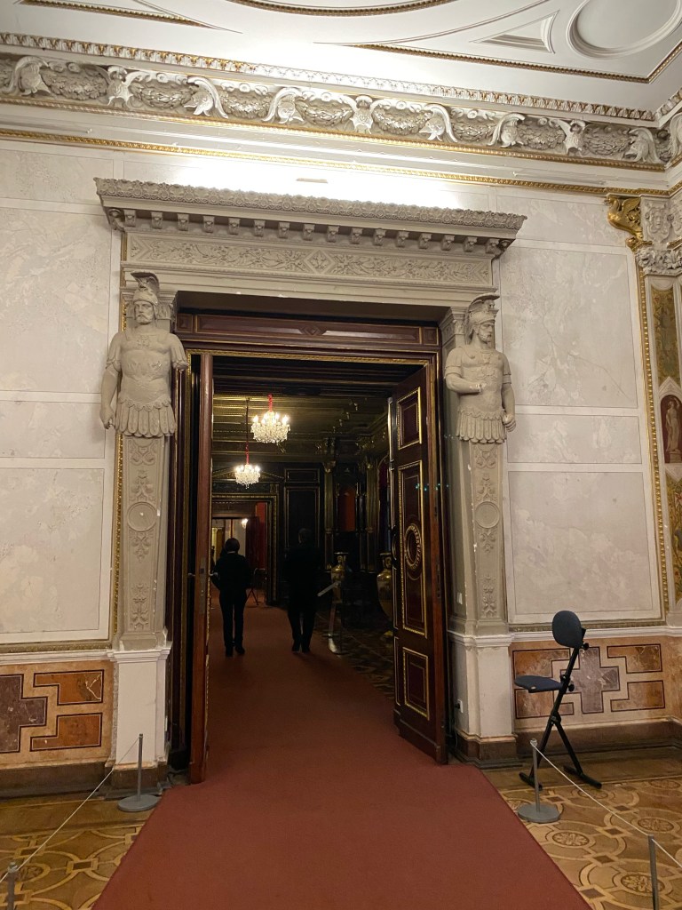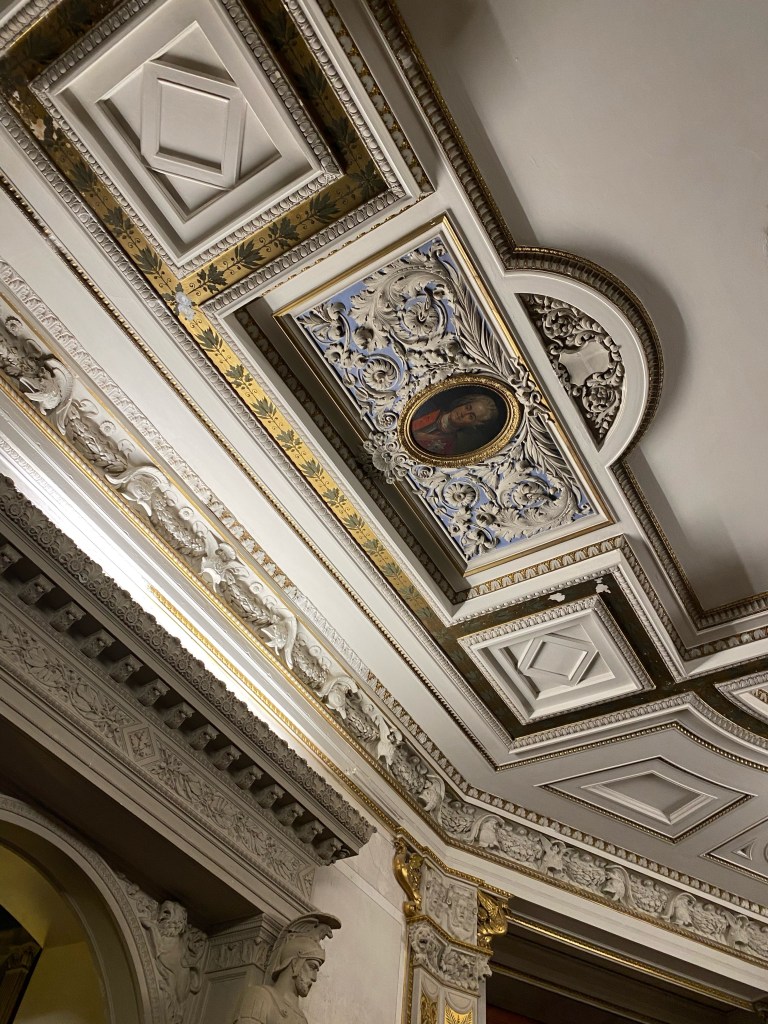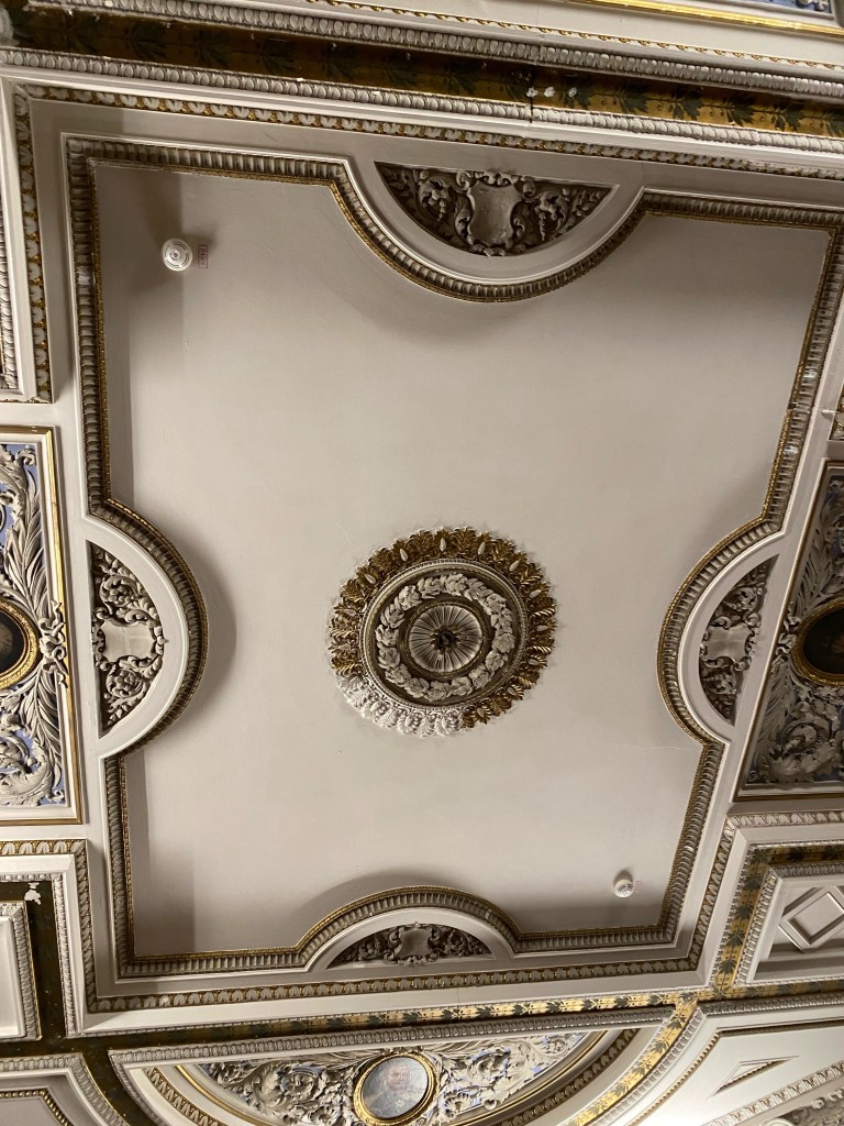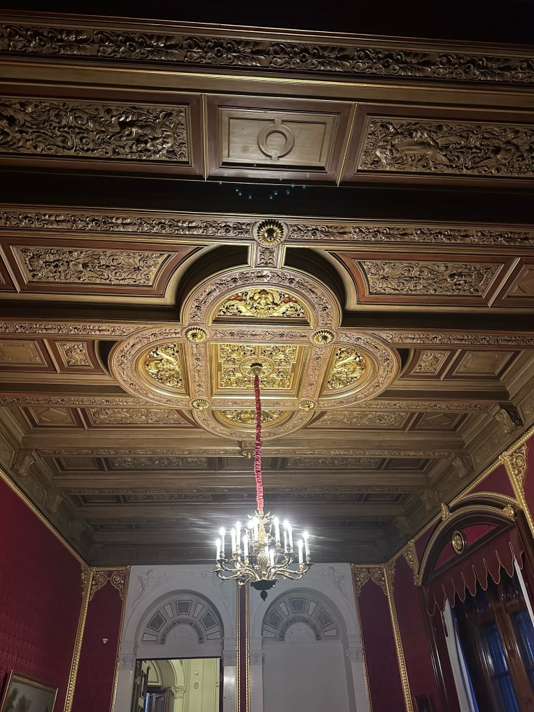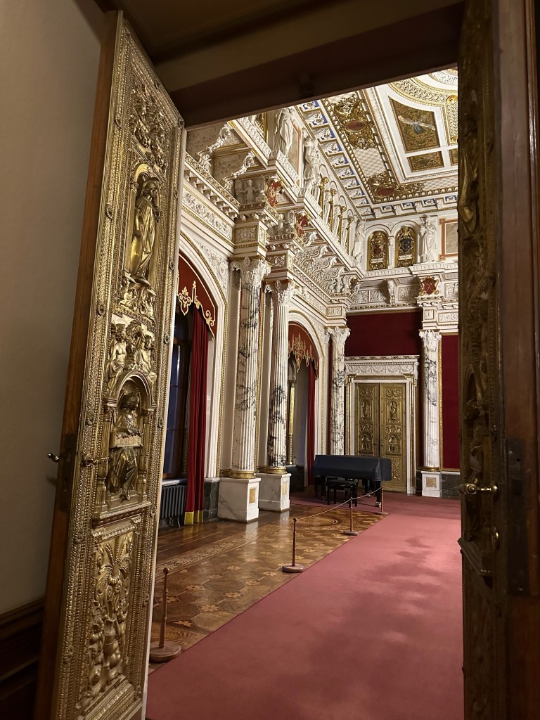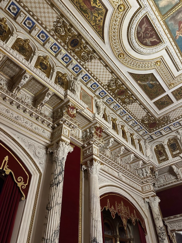 After getting our tickets we rushed up the stairs because by the time we were ready to start our tour of the castle it was 1 hour till they closed. Obviously we couldn’t do a guided tour because it was close to closing time but we still enjoyed it. We walked through the rooms at our own pace and enjoyed the artwork and interior design that surrounded us. Every single detail put into the wall designs were absolutely gorgeous, especially the throne room. The throne room was heavenly. From the gold trims to the beautiful painting on the ceiling it was royally magnificent. When you look up at the ceiling you will also notice the different crest of each city of Mecklenburg surrounding the room. We looked all the way around until we found Rostock‘s crest, which is a griffin. All in all the throne room was definitely my favorite room.